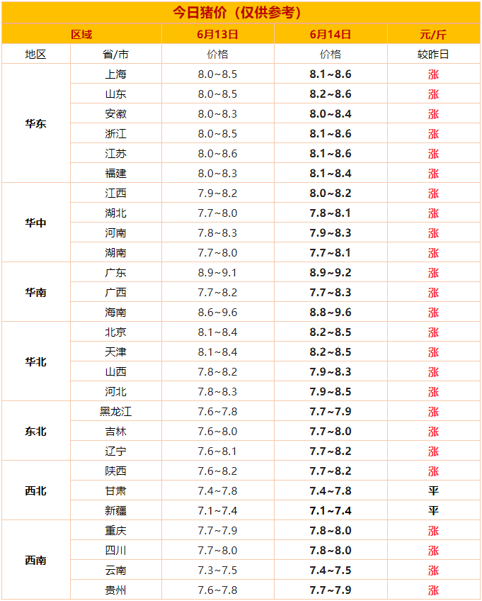 2022年6月14日全国猪价行情:今日猪价25涨2平,多地破8,全国猪价一片红,行情涨出“新高度”!(仅供参考)